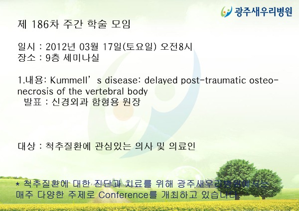 * 척추질환에 대한 진단과 치료를 위해 광주새우리병원에서는 매주 다양한 주제로 Conference를 개최하고 있습니다.