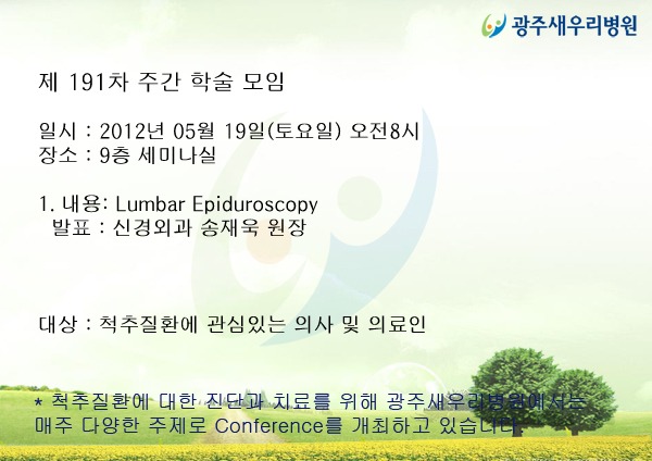 * 척추질환에 대한 진단과 치료를 위해 광주새우리병원에서는 매주 다양한 주제로 Conference를 개최하고 있습니다.