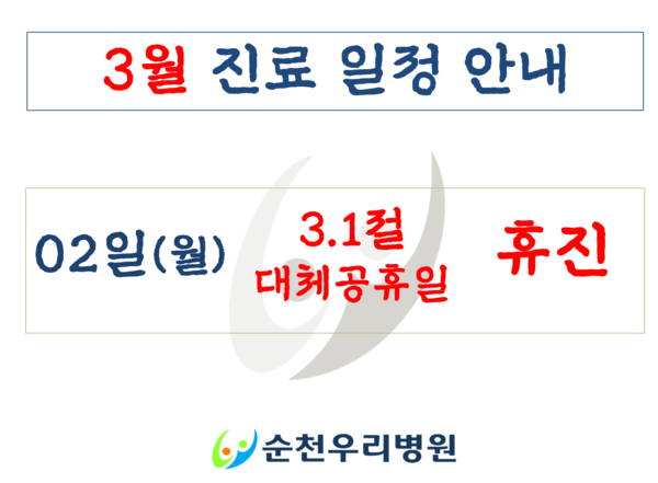 저희 순천우리병원 3월2일(월) 3.1절 대체공휴일은 휴진입니다.